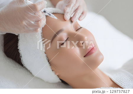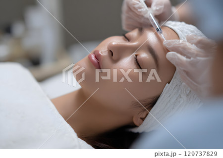 若い女性の額にしわ取りやアンチエイジングのためボトックス注射を行うシーン