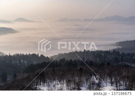 冬の屈斜路湖に昇る朝日に染まる雲海