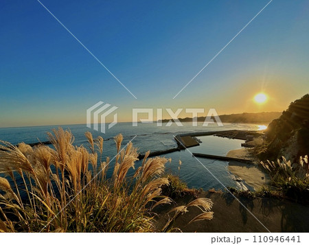 海に沈む夕日とススキ 「塩屋岬」