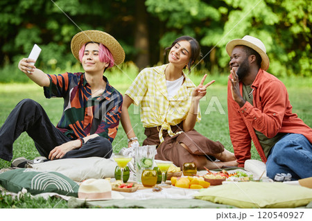 Group of young people sitting on blanket in park, enjoying picnic and capturing moments using smartphone while sharing laughter and diverse cuisines