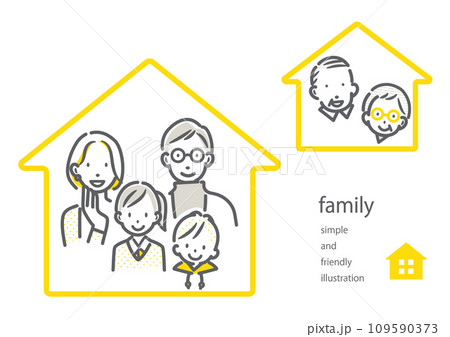 ミドル世代の4人家族と離れて暮らす祖父母 シンプルでお洒落な線画イラスト