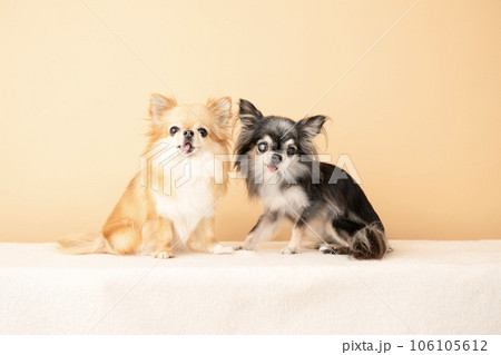 お座りした2匹のチワワ