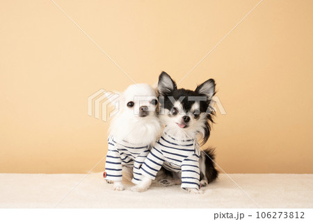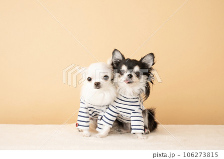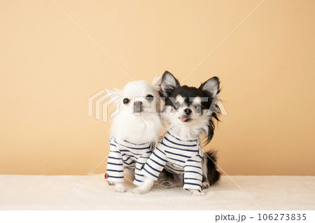 ボーダーの服を着てお座りした2匹のチワワ