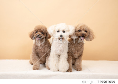 ベージューバックと微笑む3匹のトイプードル