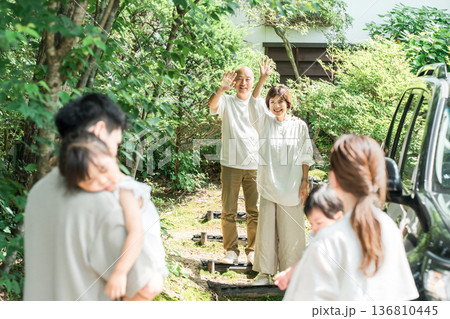 実家に帰省した孫娘を抱っこする母親と父親と出迎える両親(里帰り,三世代家族)
