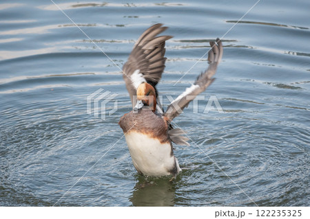 川の中で羽ばたくヒドリガモ(オス) 大阪市土佐堀川 中之島公園