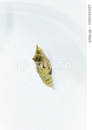 白バックに羽の模様が綺麗に透けたキアゲハチョウのサナギ、縦