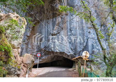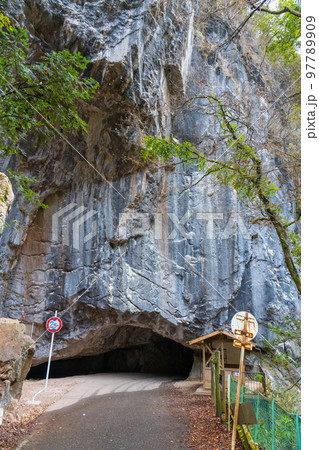 羽山渓の岩石をくり抜いたトンネルの入り口 県道300号