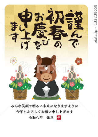 【令和八年】門松と羽織袴の午(うま)に筆文字の賀詞を添えた年賀状