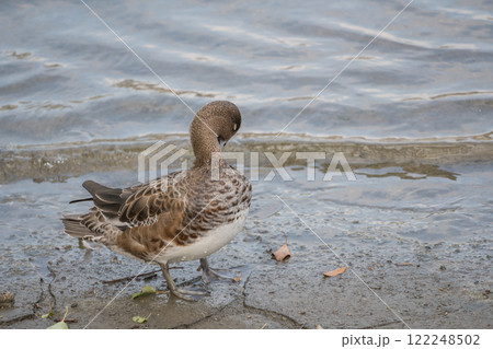川岸で体の手入れをするヒドリガモ(メス) 大阪市土佐堀川 中之島公園