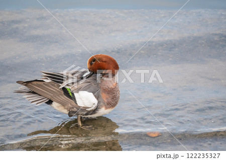 川岸で羽繕いするヒドリガモ(オス) 大阪市土佐堀川 中之島公園