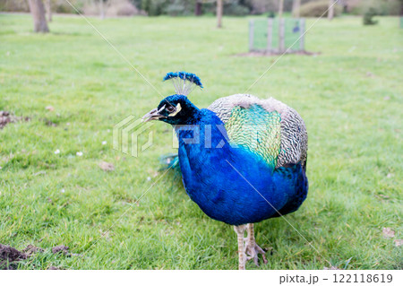 優雅に芝生の上を行くきれいな藍色の首周りの羽をもつ大きな孔雀 ロンドン郊外のキューガーデンにて