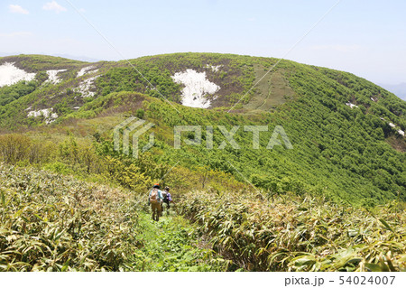 雪渓山道を歩くシニア夫婦