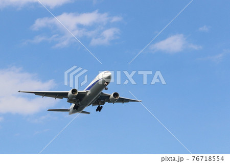 夏空に飛ぶ旅客機 夏の雲を背景に着陸進入する旅客機