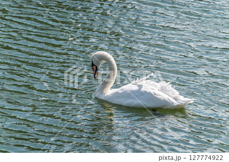 A graceful white swan swimming on a lake with dark water. The white swan is reflected in the water
