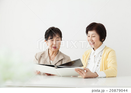 アルバムを見つめるシニア女性とミドル女性 家族写真