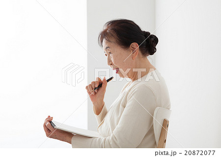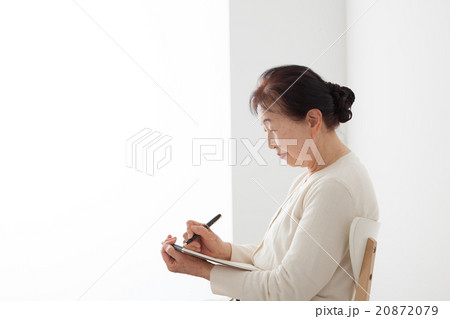 椅子に座ってノートを書くシニア女性 自分史