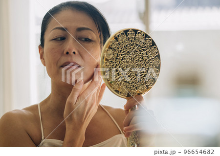 鏡を見ながらほうれい線に手をあてて気にする女性
