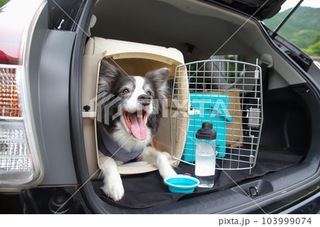 ボーダーコリーが車のトランクに乗っているケージに入っている様子