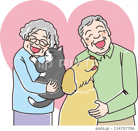 ハートを持って笑顔の人達_猫と犬と高齢夫婦_おじいちゃん_おばあちゃん_70代80代