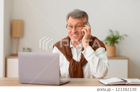 Business Call. Happy Senior Businessman Talking On Cellphone Working On Laptop In Modern Office. Selective Focus