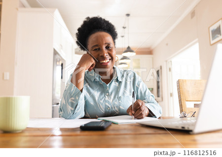 Portrait of happy senior african american woman with documents on table using laptop at home