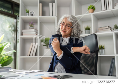 Elderly businesswoman relieving shoulder tension while seated at her modern office desk