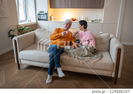 Happy laughing mature couple engaged in lively conversation, drinking tea on cozy sofa together