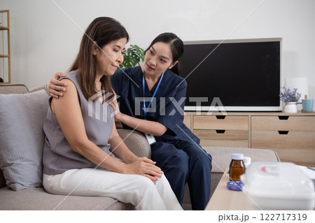 A caregiver and an elderly woman are giving advice and helping with a health check. At the home of an elderly woman