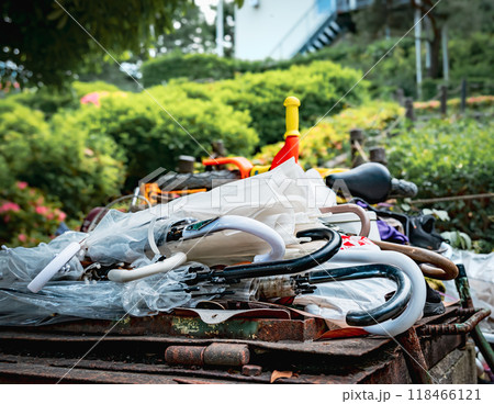 公園の片隅に処分される傘などのゴミが積まれている風景
