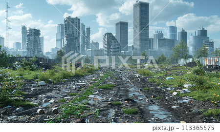 修繕されず放置されたビル群と開発放棄の空き地のある荒廃した都市