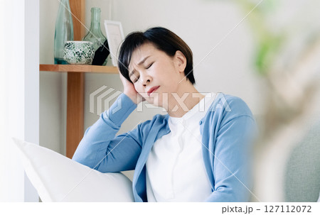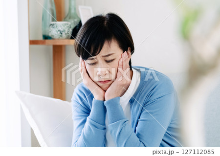 リビングで落ち込む中高年女性