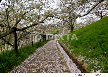 桜の花びらが散る葉桜の並木道・春の公園風景