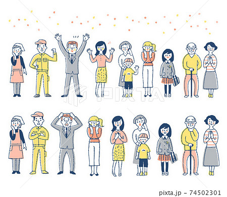 小学生から中高年までの市井の人々の喜怒哀楽の表情集 セット イラスト素材