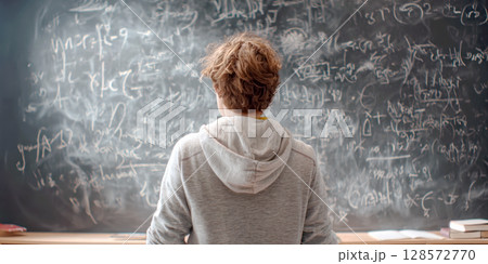 Student viewed from behind, facing a chalkboard filled with complex equations. Capturing the essence of intense study, problem-solving, and academic challenge in mathematics or physics