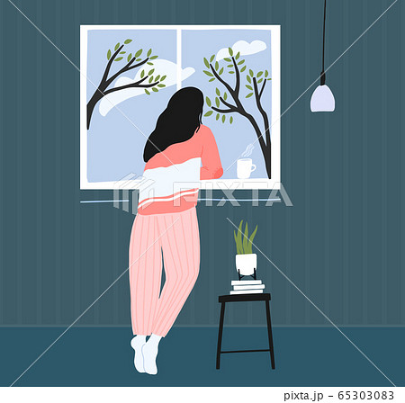 Young woman at home longing at window. Spring landscape outside, blue sky with clouds and trees. Cozy pink pajama. Self isolation concept illustration.