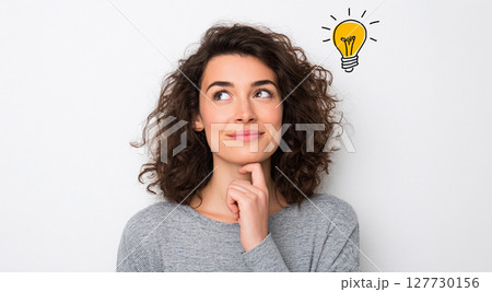 Woman with curly hair has an idea as a illustration lightbulb appears above her, symbolizing creativity and inspiration against a white wall