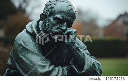 Bronze effigy of a thoughtful man contemplating in a serene garden space