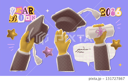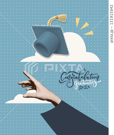 Vertical banner on the graduation theme in retro collage style. Hand with a halftone effect throw graduation hat into the air , in blue cloudy sky. Happy 2026 graduation day. Torn out paper vector