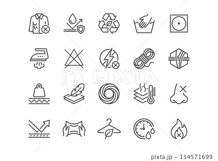 Fabric properties and material technology line icons. Vector symbols for waterproof, breathable, UV protection, thermal, sustainable, and durable textile features.