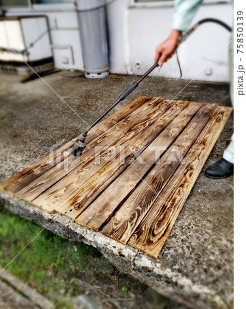 バーナーで生の杉板を火であぶり、表面を炭化させ焼き杉板作り