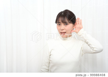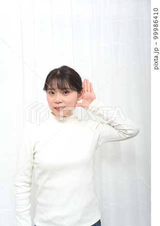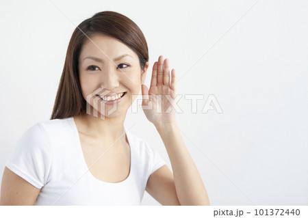 耳に手を当ててよく聞こうとする女性