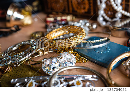closeup of beautiful costume jewelry, earrings, beads, bracelets and rings