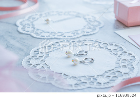 淡水真珠のフープイヤリングとペンダント レースペーパー リボン プレゼントイメージ