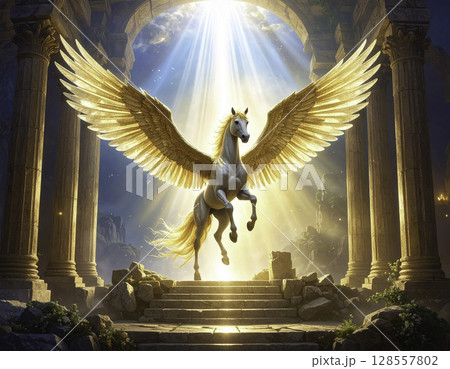 神殿に舞い降りた黄金の翼を持つ神話のペガサス