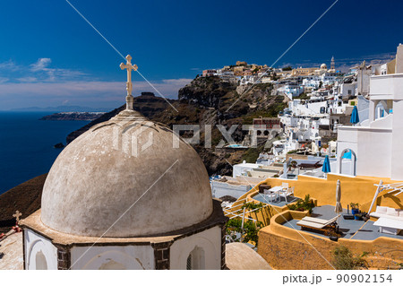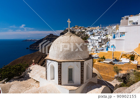 ギリシャ サントリーニ島のフィラにある聖イオアニス・テオロゴス教会と街並み