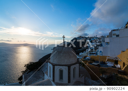ギリシャ サントリーニ島の夕暮れ時のフィラにある聖イオアニス・テオロゴス教会と街並み