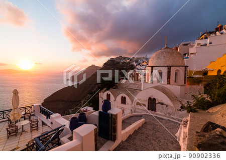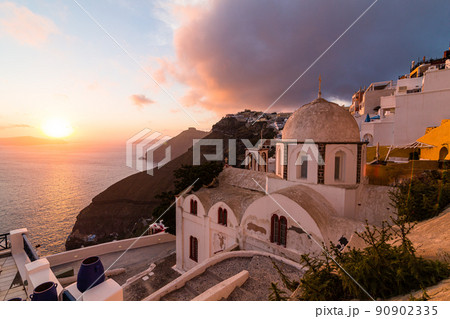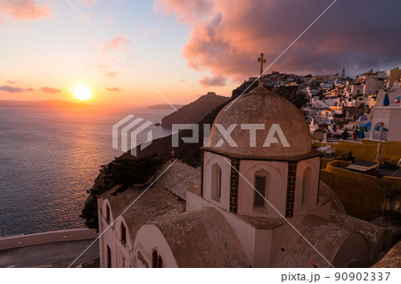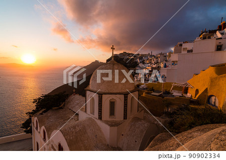 ギリシャ サントリーニ島のフィラにある聖イオアニス・テオロゴス教会から見える街並みと夕日