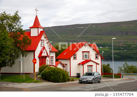 北欧の島国アイスランド共和国北部の中心都市アークレイリ 街角に建つセントピーターズ教会