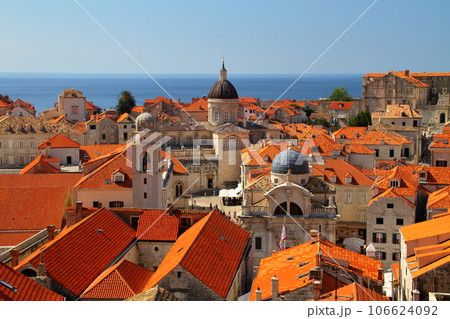 クロアチアの世界文化遺産、アドリア海の真珠ドブロブニク 城壁から望む教会が並ぶ旧市街とアドリア海